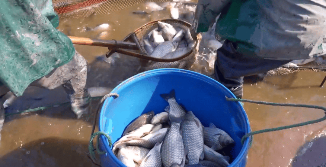 冬日的翻身塘水库虽然寒意渐浓,但捕鱼现场却是一派热火朝天的景象。身着专业摸鱼服的工人们合力拉起渔网,伴随着渔网的收紧,螺蛳青、白鲢、鲫鱼、鲈鱼等各类鱼儿翻腾跳跃,其中鲫鱼占比超过六成,满塘都是丰收的喜悦。捕捞上来的鲜鱼,被工人们装进桶里,一担担扛上岸进行称重,忙得不亦乐乎。“昨天开始抓的,昨天大概有6万多斤,预计产量在十几万斤左右。”鱼塘负责人沈世艇高兴地说。