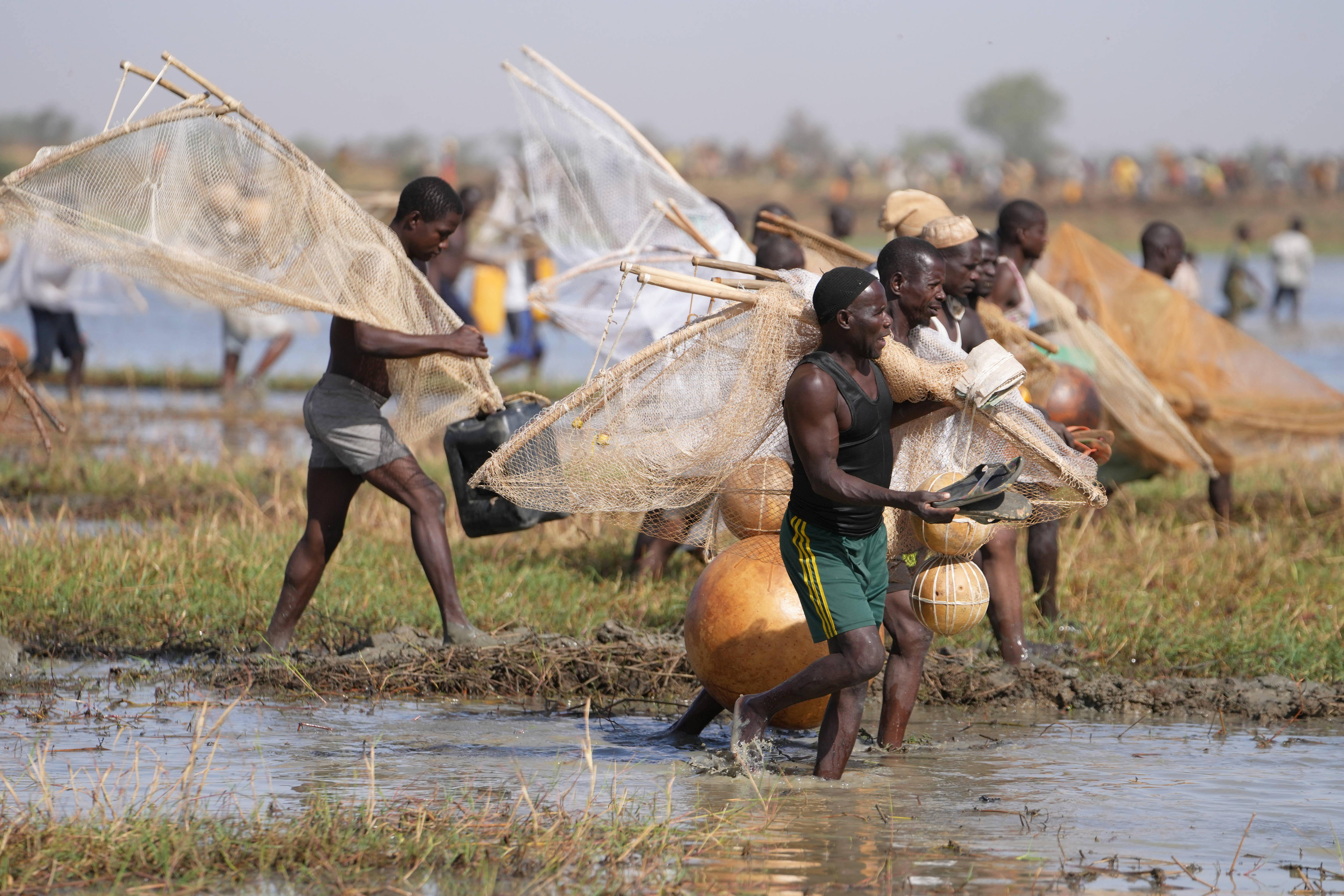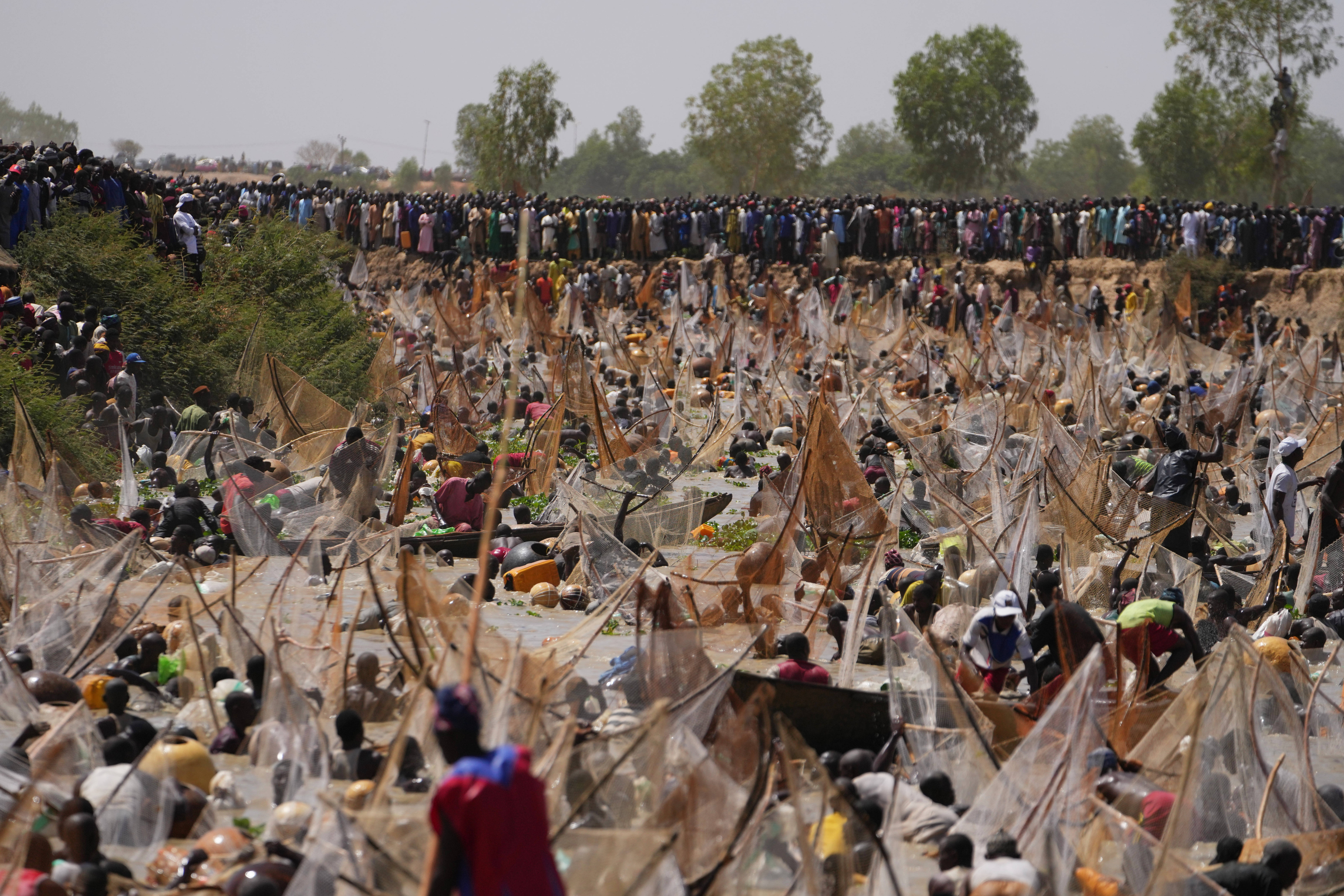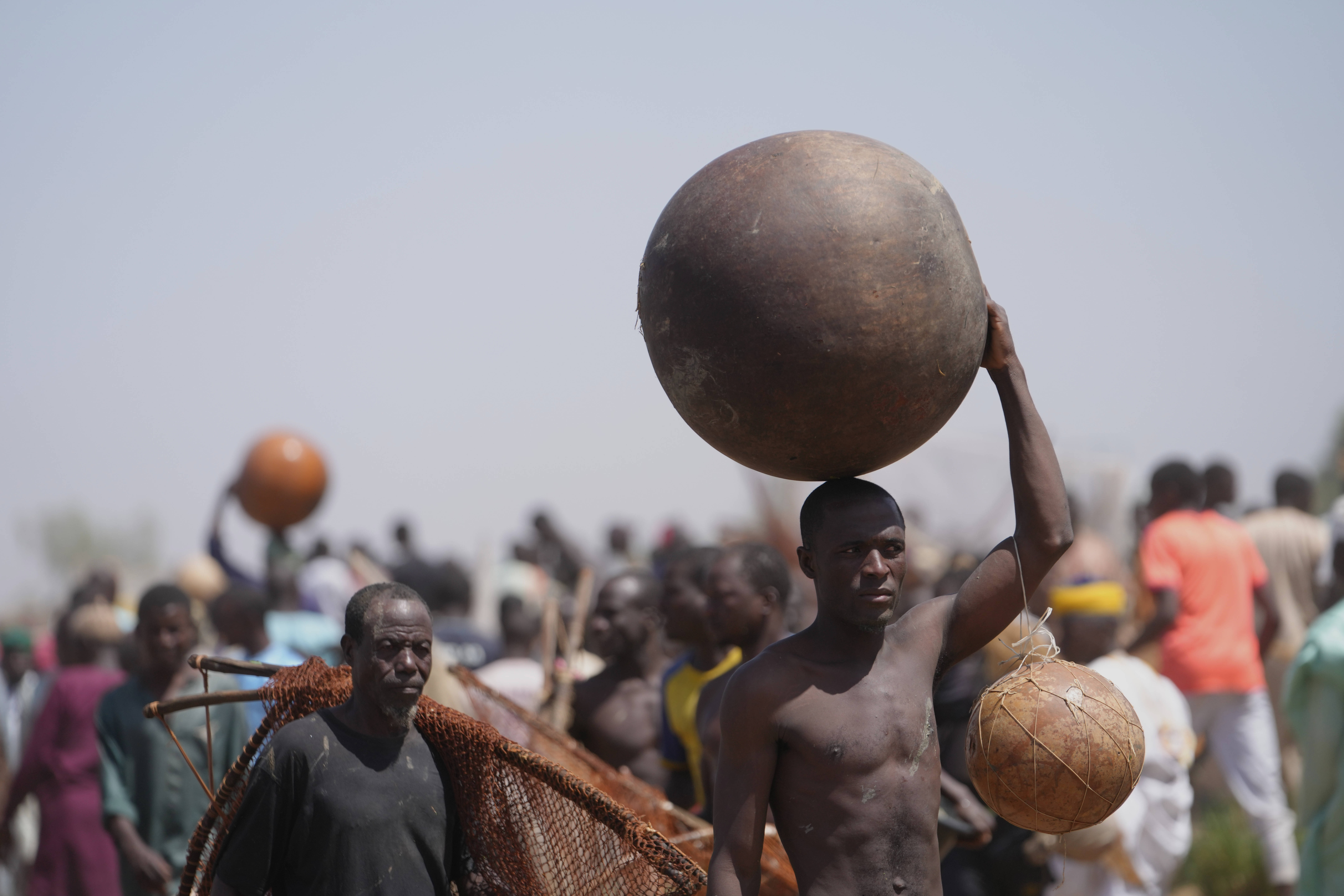 2月14日,在尼日利亚北部凯比州,人们参加阿尔贡古捕鱼节。 新华社/美联