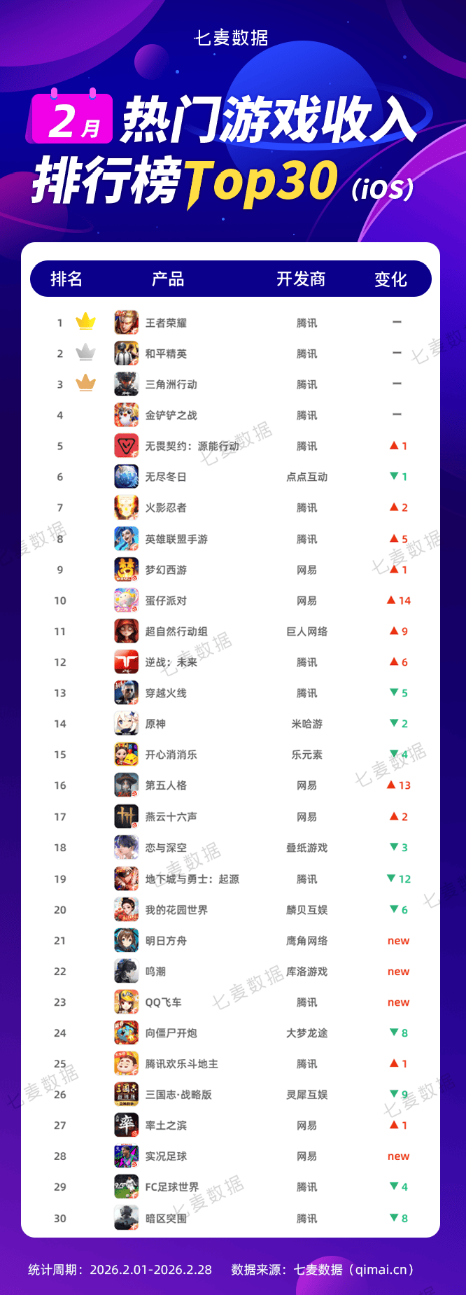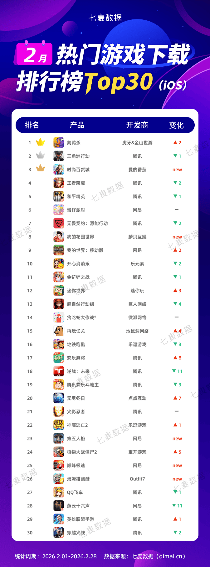 以上就是2月的热门游戏榜单Top30啦~整体来看,2026年2月游戏市场围绕春节档展开了激烈的流量角逐,以节日版本、IP联动、福利活动等为核心抓手拉动玩家活跃及转化,社交推理、女性向、射击等赛道各有亮点,也印证了不同品类游戏的市场潜力。随着三月的到来,游戏行业又将迎来哪些新机遇?让我们拭目以待!返回搜狐,查看更多