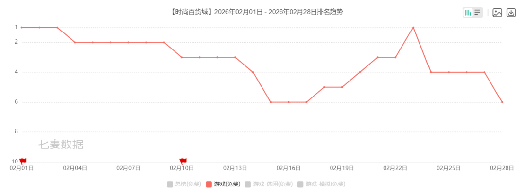 「时尚百货城」是深圳爱的番茄科技有限公司推出的女性向模拟经营手游,据七麦数据显示,该游戏于2026年1月28日上线App Store,上线不久便迅速冲进免费榜Top5并很快登顶榜首,2月更是持续占据榜单前列,成为春节档休闲经营赛道的黑马产品。