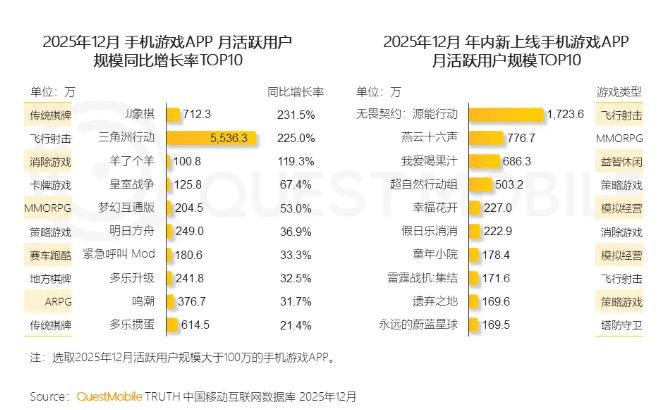 【10】3月10日,Quest Mobile发布了《2025中国移动互联网年度大报告》。报告表示,当前手游市场流量增长多赛道多点开花,《JJ象棋》《三角洲行动》《羊了个羊》用户规模翻倍增长。其中,《三角洲行动》2025年12月MAU同比增长225%达5536万。