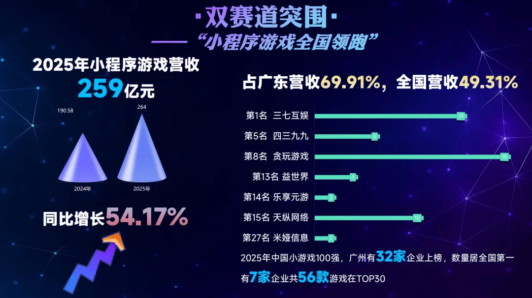 【1】3月12日,广州市游戏行业协会发布《2025年广州游戏产业发展报告》。2025年,广州游戏营收达到1532亿元,占据全国43.69%份额。其中,小游戏全年贡献259亿元营收,以54.17%的增长率领跑全国,有32家广州企业进入2025年中国小游戏500强,包括三七互娱、4399、贪玩、益世界、乐享元游、天纵网络、米娅信息等。