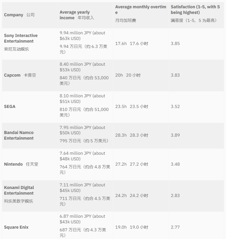 【8】近日,提供日本企业劳动条件信息服务的OpenMoney发布了一组统计数据,聚焦卡普空、任天堂等本土游戏大厂的实际工作状况。数据显示,索尼互动娱乐收入榜上断层领先,加班时长却是最少。卡普空、SEGA紧随其后,任天堂名列第三。