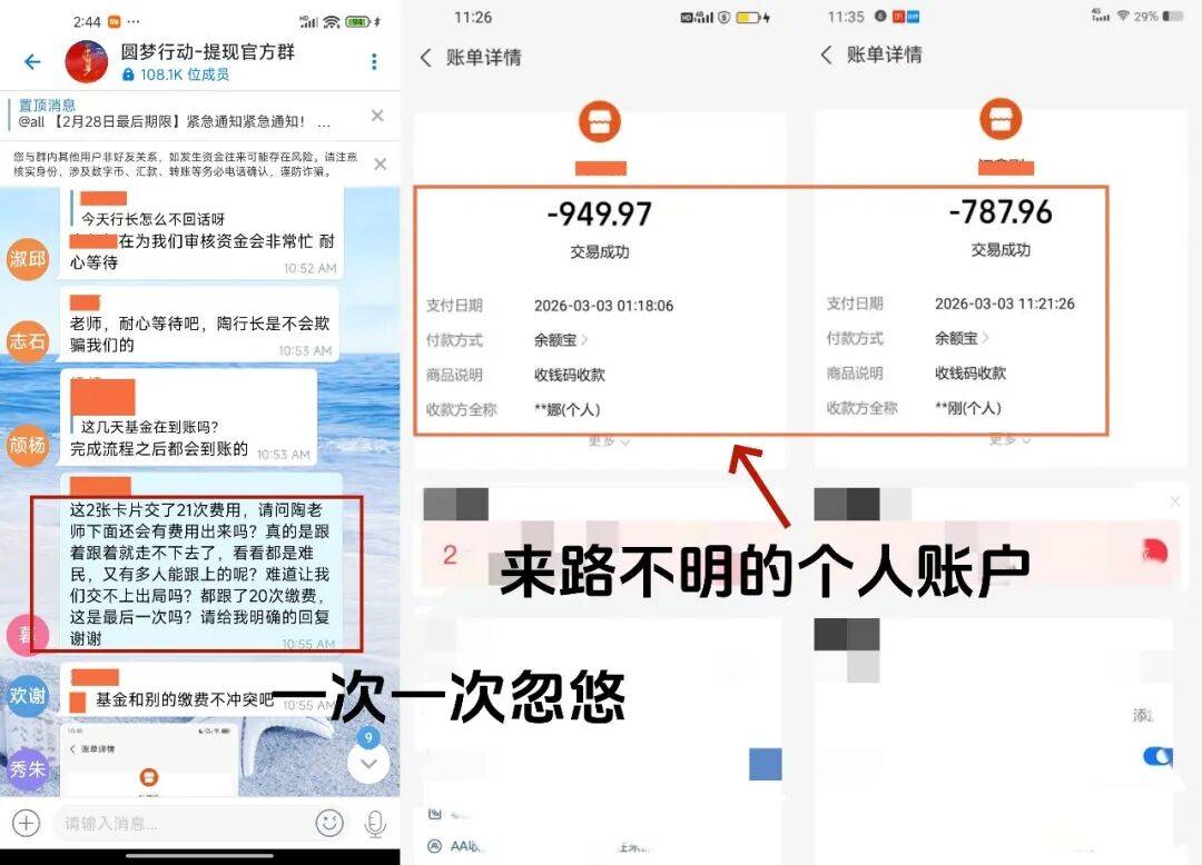 近日,又在忽悠参与者交纳“申请退款免排队打款”,诸多参与者都已经转了700-1000元不等,而所有的转款记录显示,所有的账户都是来路不明的个人。