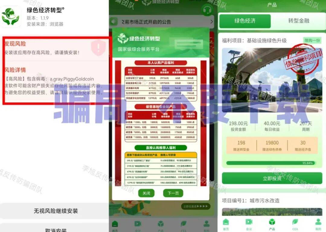 打着国家绿色经济政策旗号,利用“绿色主权债券”“金融转型金”吸引实名注册。推出各类虚假理财项目,还通过层级划分鼓励邀约新人,要求参与者提交详细个人信息、上传身份证正反面。该APP无法在正规应用商店下载,打开后被提示高风险且携带病毒,服务器同样位于境外。