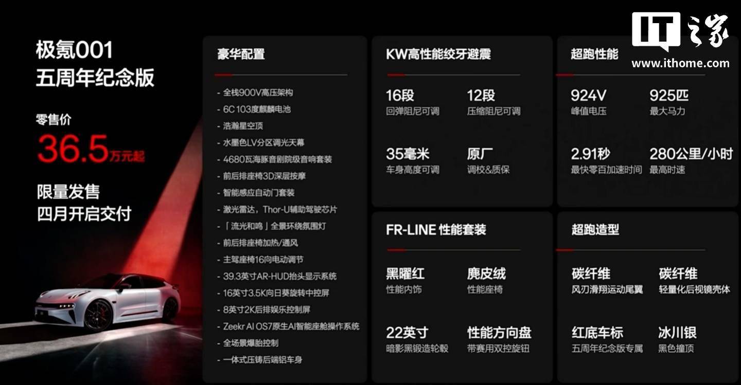 新车基于标准版换装 FR-LINE 性能套装,包含黑曜红内饰、22 英寸锻造轮毂、Brembo 卡钳等。搭载与 001 FR 同源的“极氪赛道”性能软件,支持竞速模式、智能辅助漂移。配备 4680 瓦音响、后排娱乐屏、31 颗辅助驾驶硬件,最长续航 680km。
