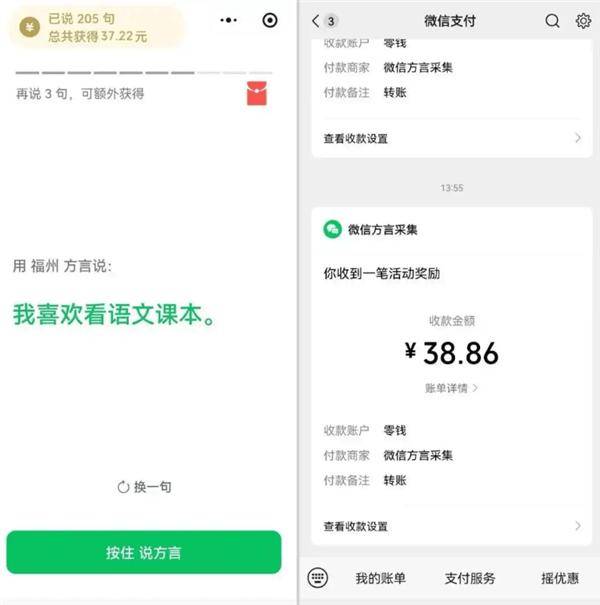 微信近日面向部分用户开启“方言采集”活动,受邀用户朗读指定方言句子即可获得现金红包,据估算单日收益最高可达 40 元。该活动不仅为语音转文字功能收集数据,也间接回应了我国方言传承面临的严峻挑战。