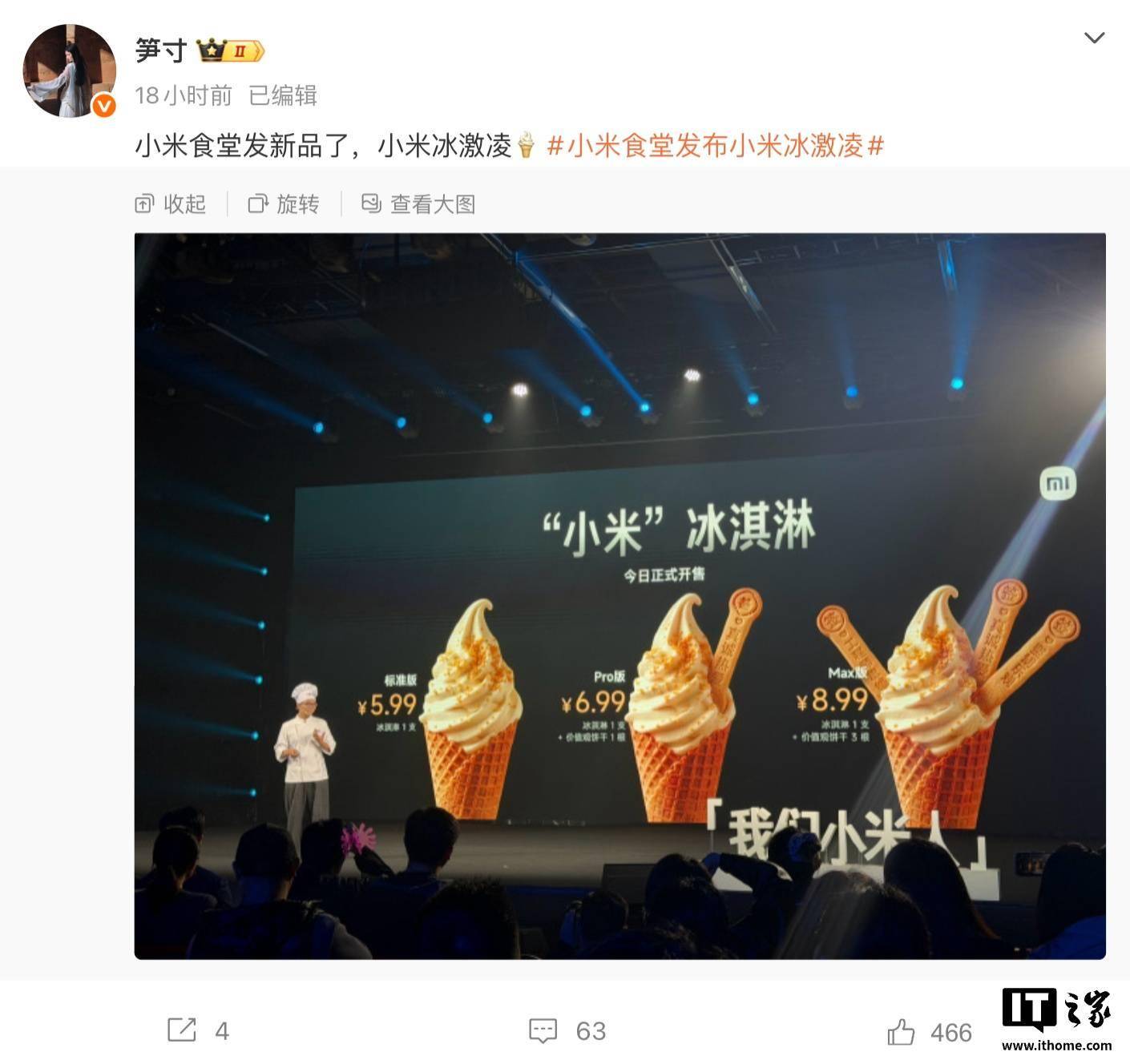 18、员工晒小米食堂新品“小米冰淇淋”:提供标准 / Pro / Max 三种版本,5.99 元起